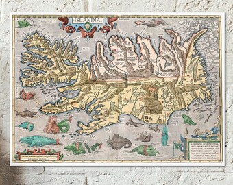 1590 Islandia Iceland Map Sea Monsters Historic Vintage Poster